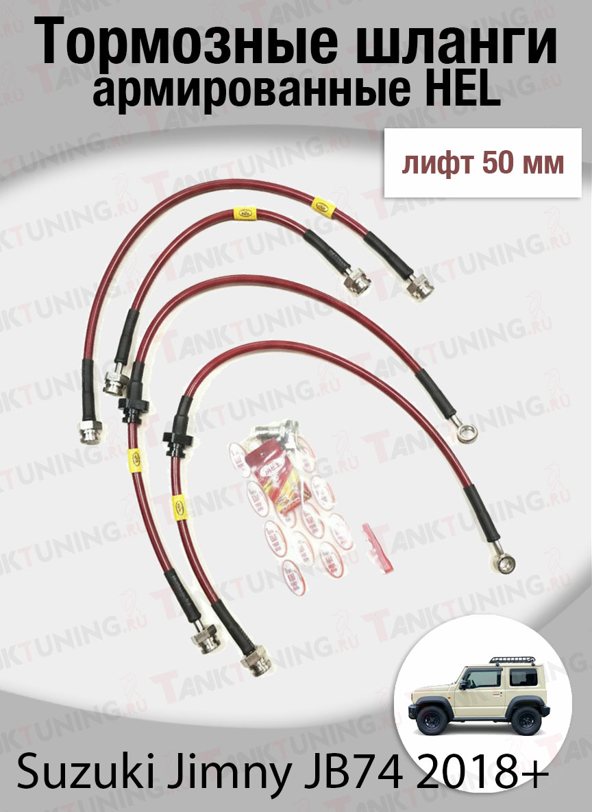Комплект армированных тормозных шлангов для Suzuki Jimny 2018+. Нержавеющая оплётка уменьшает расширение шланга под давлением, снижает риск протечек и повышает стабильность торможения. Температура −70…+260 °C. Сделано в России.